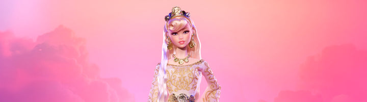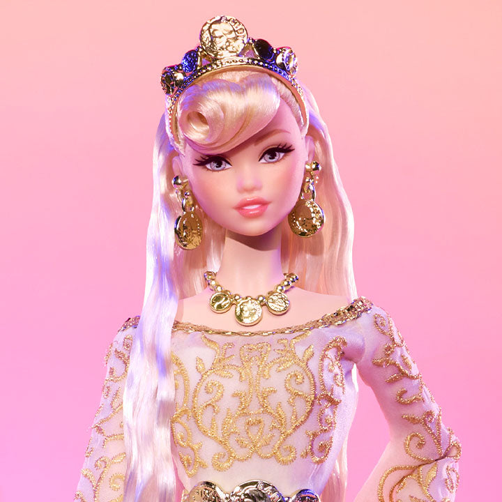 Meet a goddess from an entirely new plane: the Fantastical Realms. We gave Barbie Club 59 members the power to choose what type of fantasy doll they wanted to add to their collections. Their votes led to this regal superstar, inspired by the goddess Fortuna. A striking figure, she’s draped in an ethereal white gown with white-golden touches from head to toe. The dress features dramatic bell sleeves and a high slit, while accessories replicate the look of gold coins, a cornerstone of the goddess she’s based on.