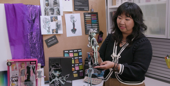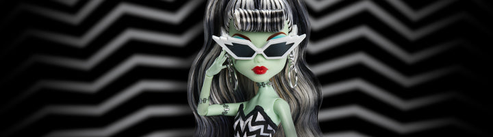 For the 80th anniversary of Mattel, we’re bringing two of our celebrated dolls together in a monster mashup. Paying homage to the original 1959 Barbie “Original Teenage Fashion Model” doll, Frankie Stein doll is all stitched up for a beach day in her striped swimsuit, lightning-bolt sunnies, and hoop earrings. She even has an outfit change at the ready to take her from day to fright! In a dark gown that glitters like the night sky, she’s all set for her “Solo in the Spotlight” moment at the scariest soirée in Maliboo.